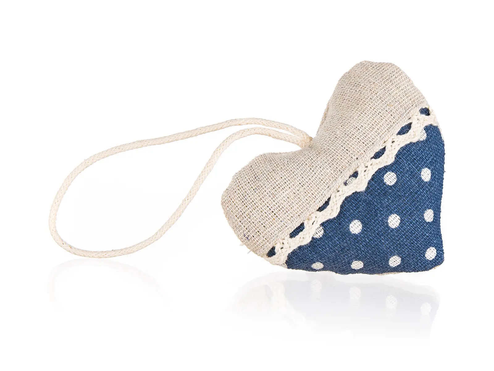 Dekorativní srdce na zavěšení, kombinace přírodní barvy a modré látky s bílým puntíkem, materiál: bavlna, rozměr 8 x 7 cm. Vhodné pouze pro dekoraci.