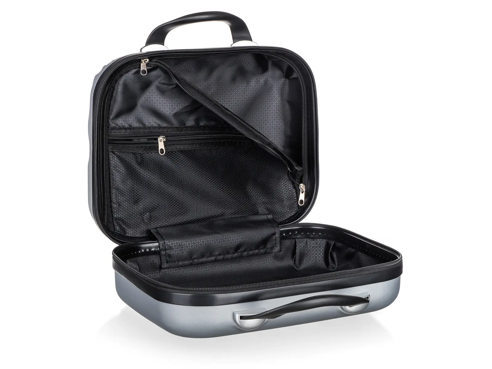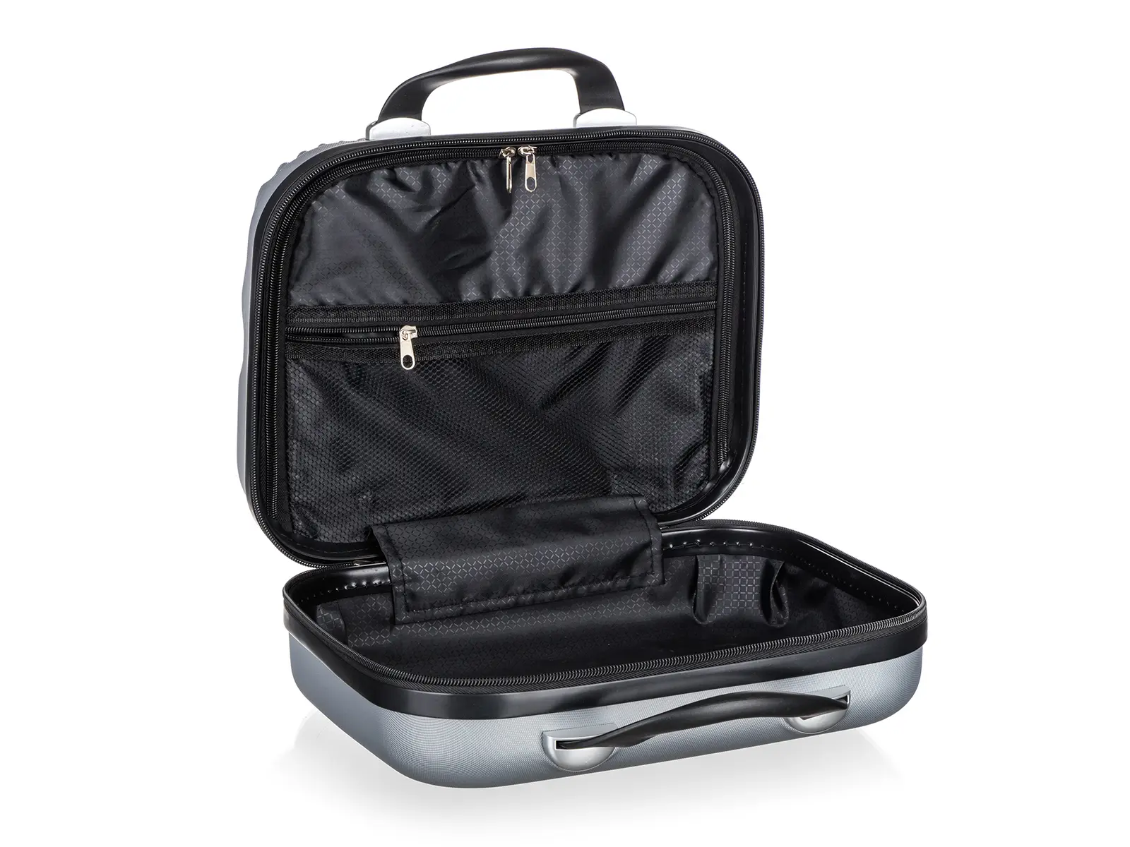 Vnitřní část kufříku má látkovou dělící přepážku s uzávěrem na zip a menší síťkovou kapsu uzavíratelnou zipem pro lepší uspořádání vašich věcí.