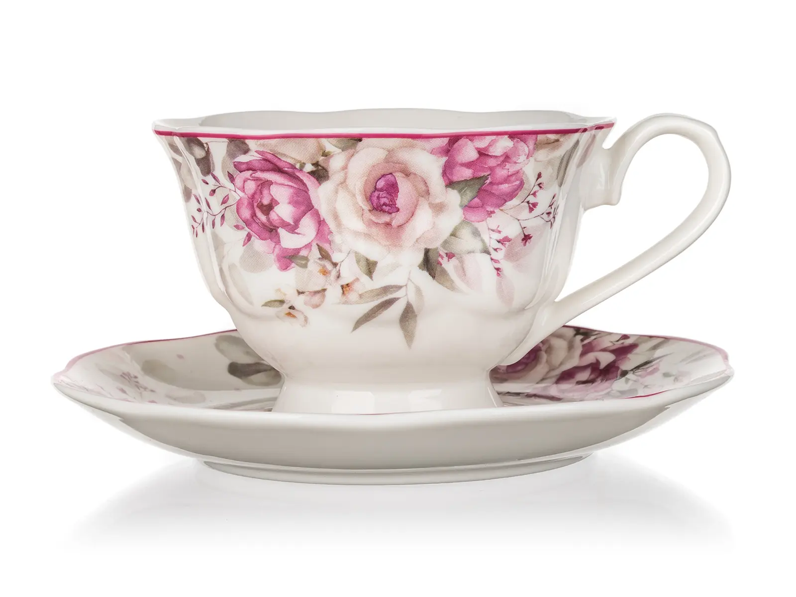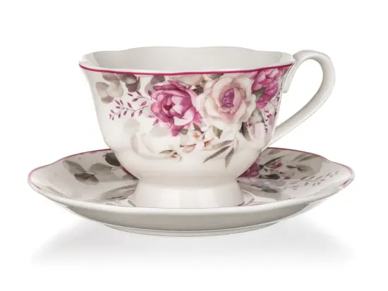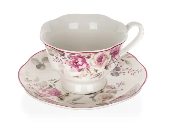 Šálek s podšálkem ROSE, s krásným květinovým vzorem, se hodí k podávání kávy nebo čaje při všedních i svátečních příležitostech.