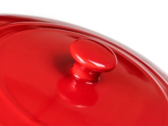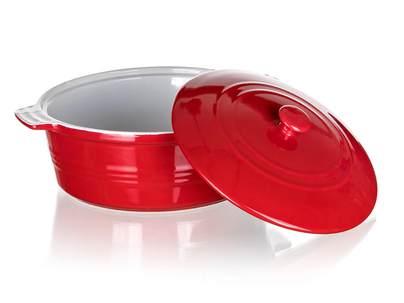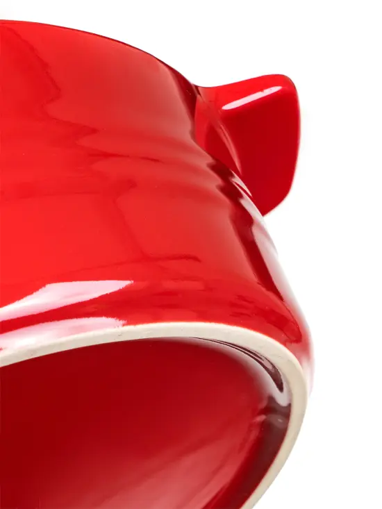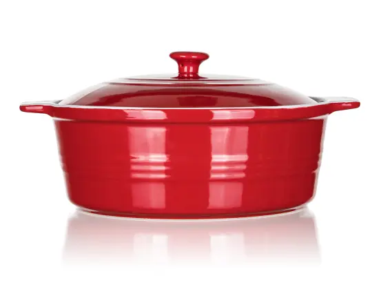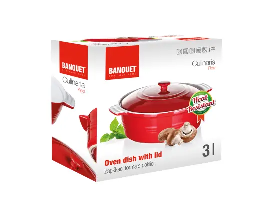 Keramická kulatá zapékací forma s víkem 31,5 x 26,5 cm CULINARIA Red s praktickými držadly pro snadnou manipulaci, výška 14,5 cm. Vnější strana červená + vnitřní strana bílá glazura. Keramické formy rovnoměrně absorbují teplo a postupně ho uvolňují, díky čemuž se pokrmy dobře propečou. Není vhodné k použití na plotně sporáku.
