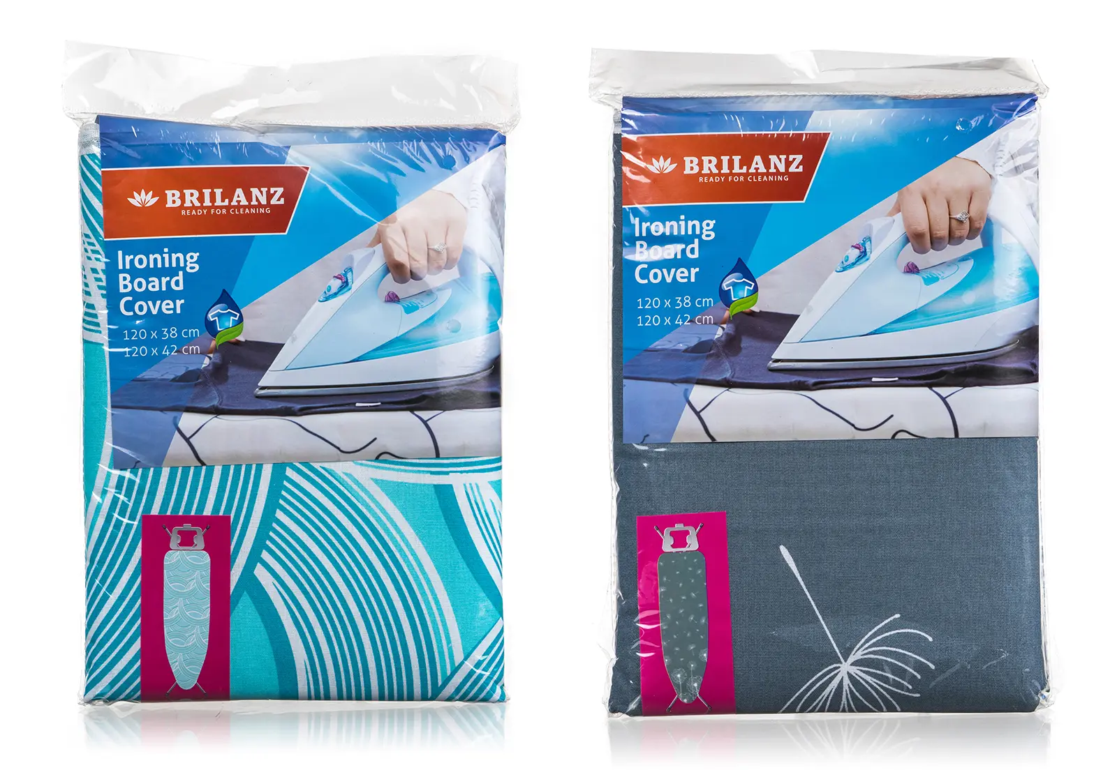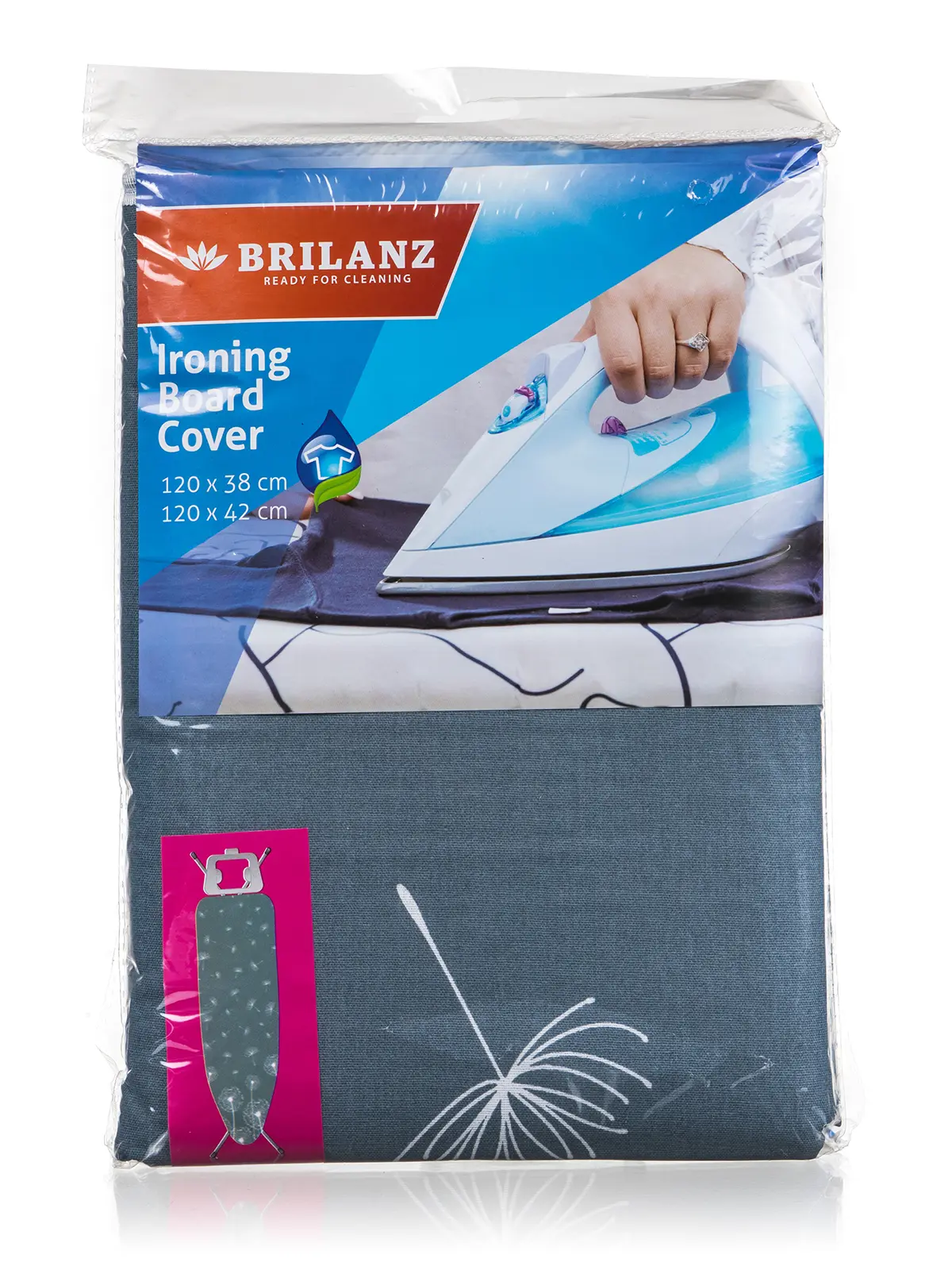 Potah na žehlicí prkno je vhodný na desky o rozměru 120 x 38 / 120 x 42 cm,