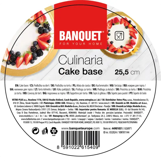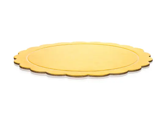 Podkładka okrągła pod tort 25,5 cm CULINARIAOkrągły podkład pod tort CULINARIA. Podkład wykonany jest z wielowarstwowej tektury o grubości 3 mm. Jest on obustronnie pokryty złotą folią, co gwarantuje wodoodporność i odporność na tłuszcz. Wymiar podkładu 25,5 cm. Podkład pod tort to idealna taca robocza, można jej używać podczas pracy z tortem, końcowej dekoracji, a także do przenoszenia tortu.