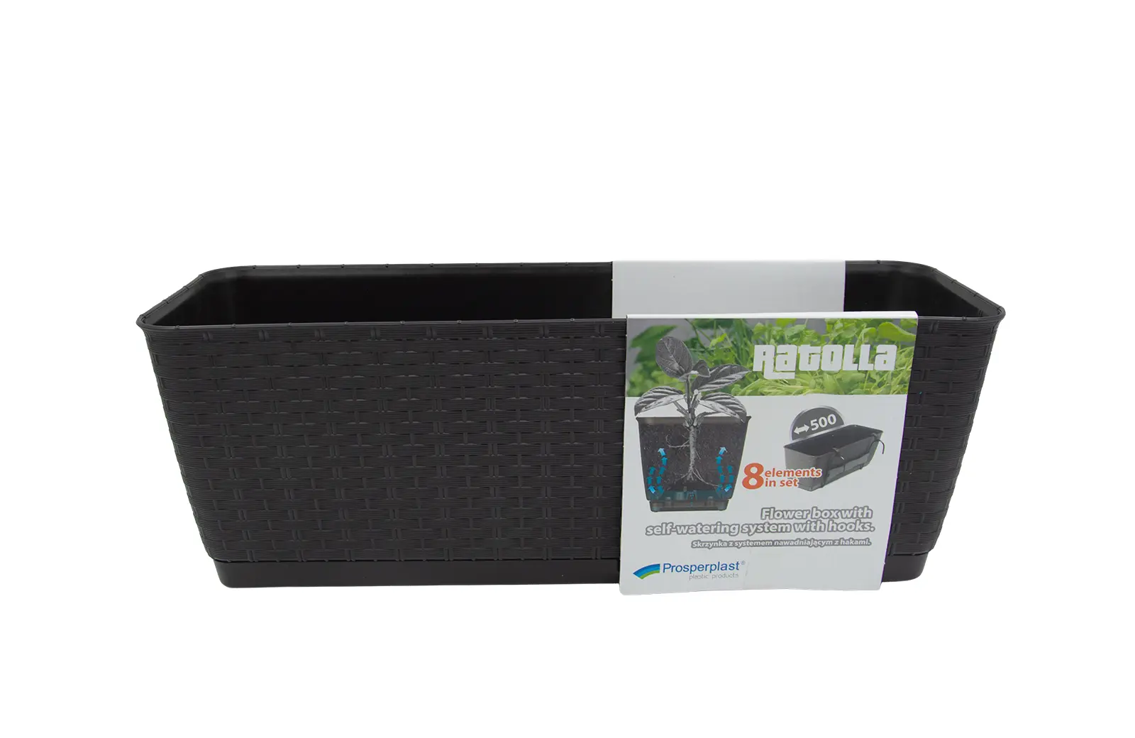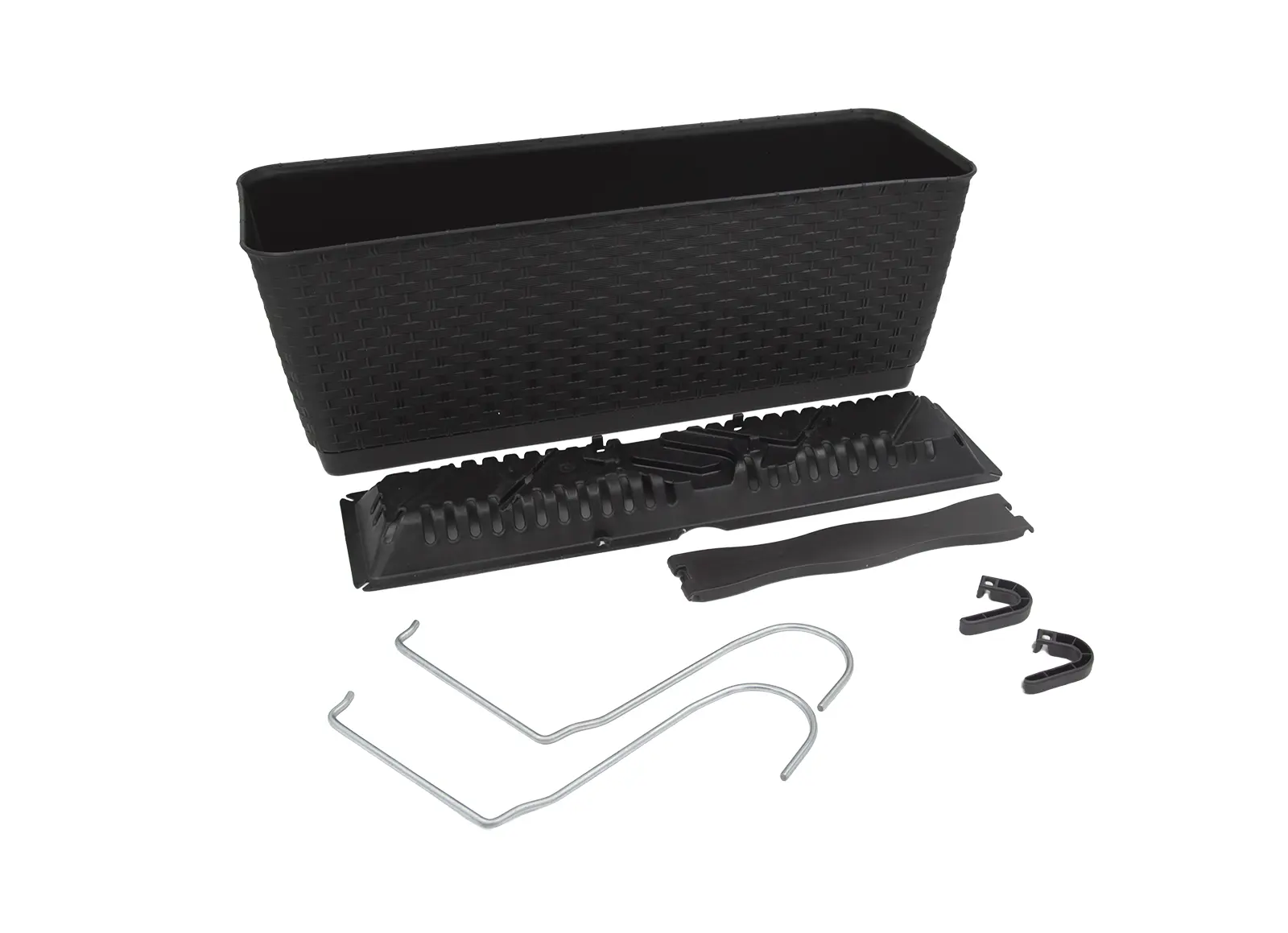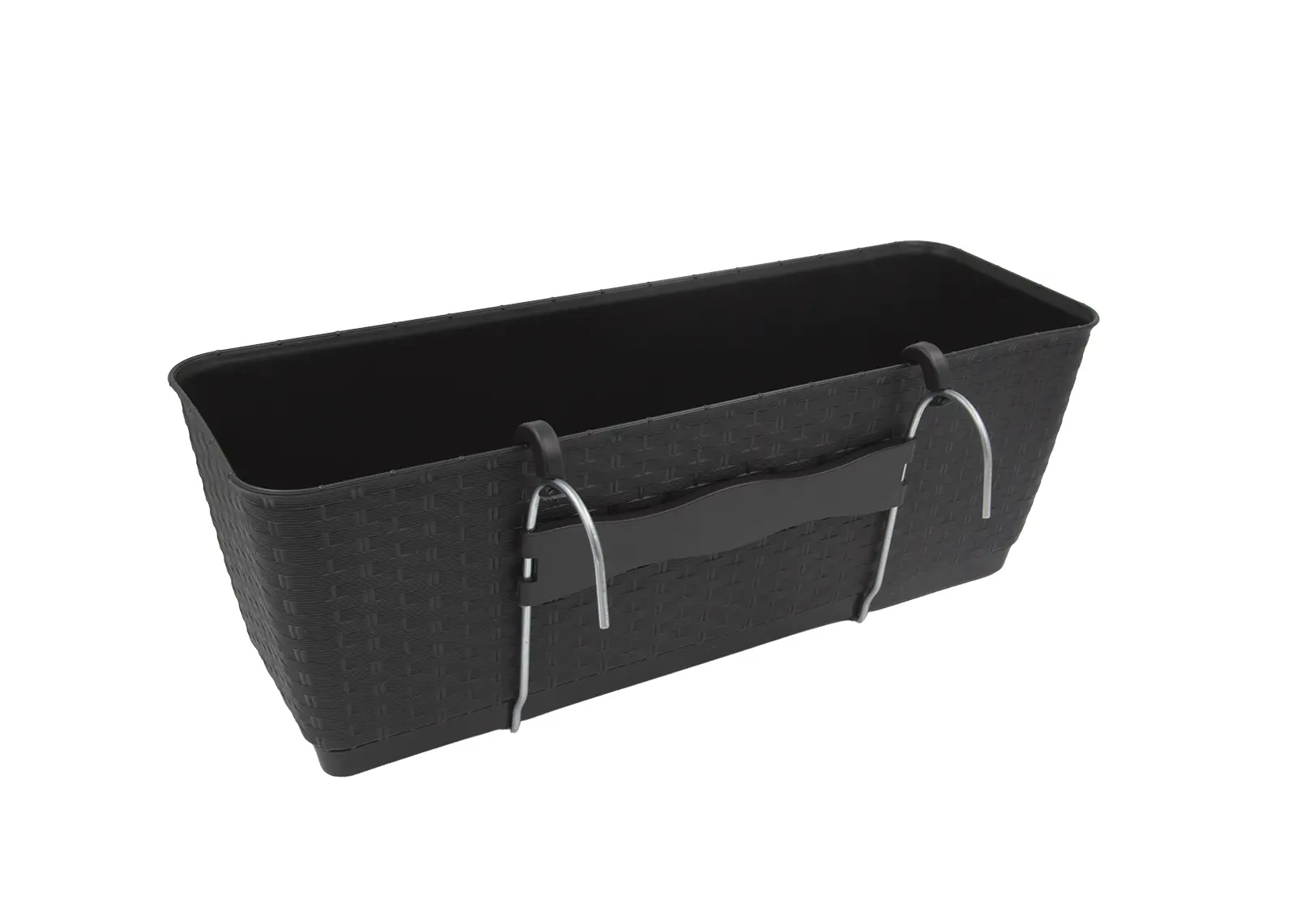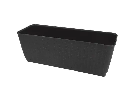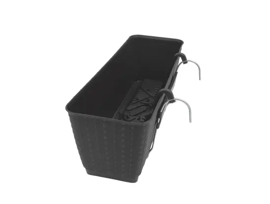 Stylowa doniczka z efektem rattanu Elegancka doniczka z powierzchnią imitującą rattan nada Twoim roślinom nowoczesny wygląd. Dzięki wkładce z systemem nawadniania ziemia dłużej pozostaje wilgotna, a zużycie wody jest mniejsze. W zestawie znajdują się haki do łatwego zamocowania na balustradzie – idealny wybór na balkon lub taras.