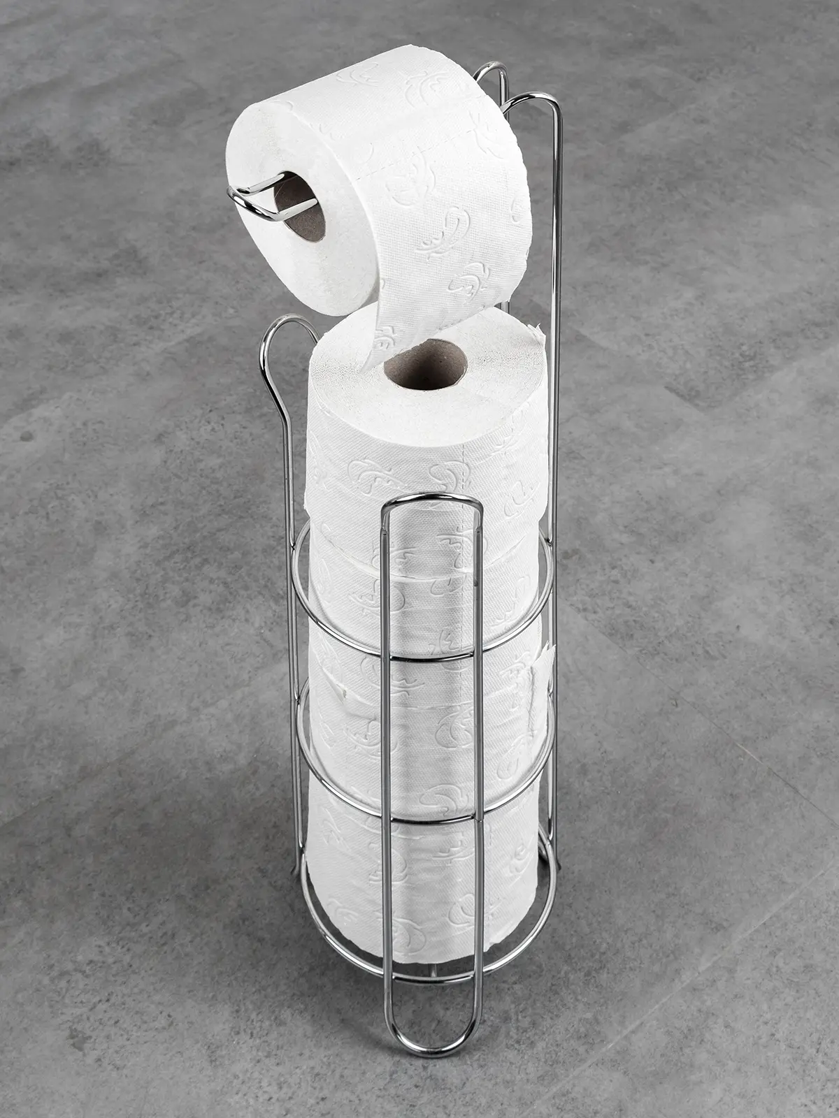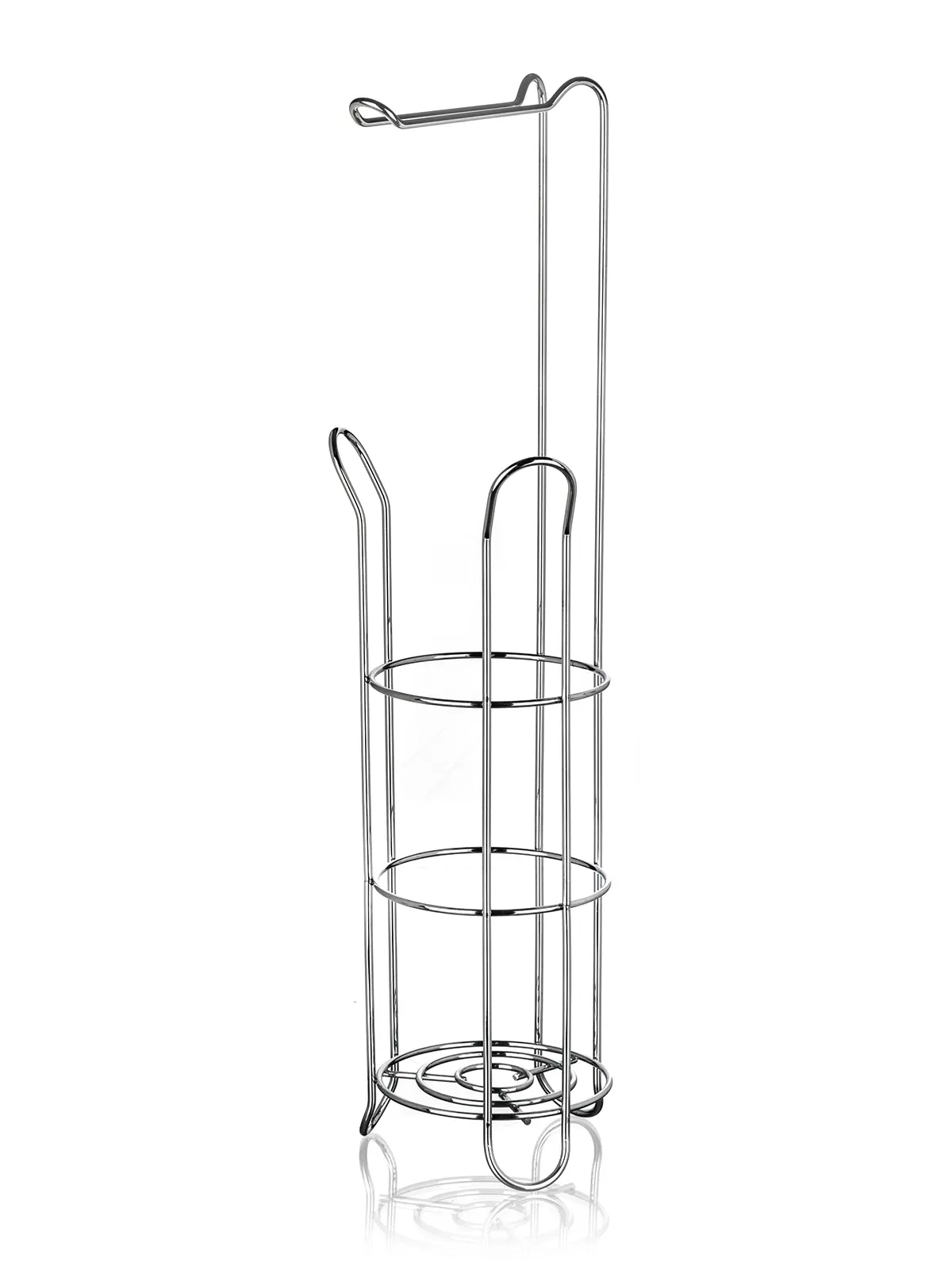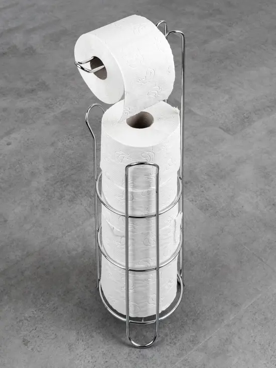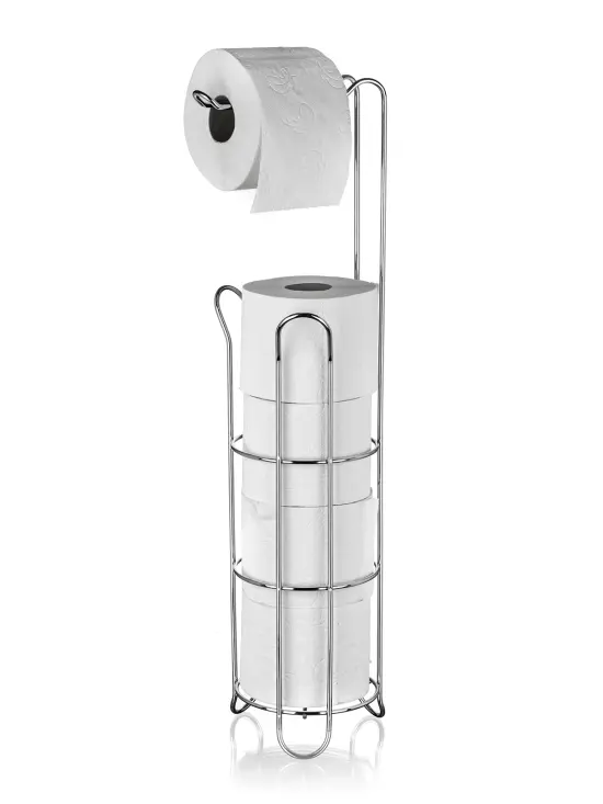 Stojan na toaletný papier s držiakom, je praktický a designový pomocník vo vašej kúpeľni. Do stojana môžete umiestniť 3 rolky toaletného papiera a ďalšie zavesiť na špeciálny držiak. Stojan je vyrobený z kvalitného železa s pochrómovanou lesklou úpravou. Rozmery: 18 x 16 x 60 cm.