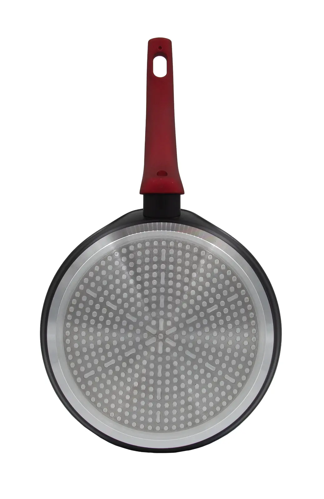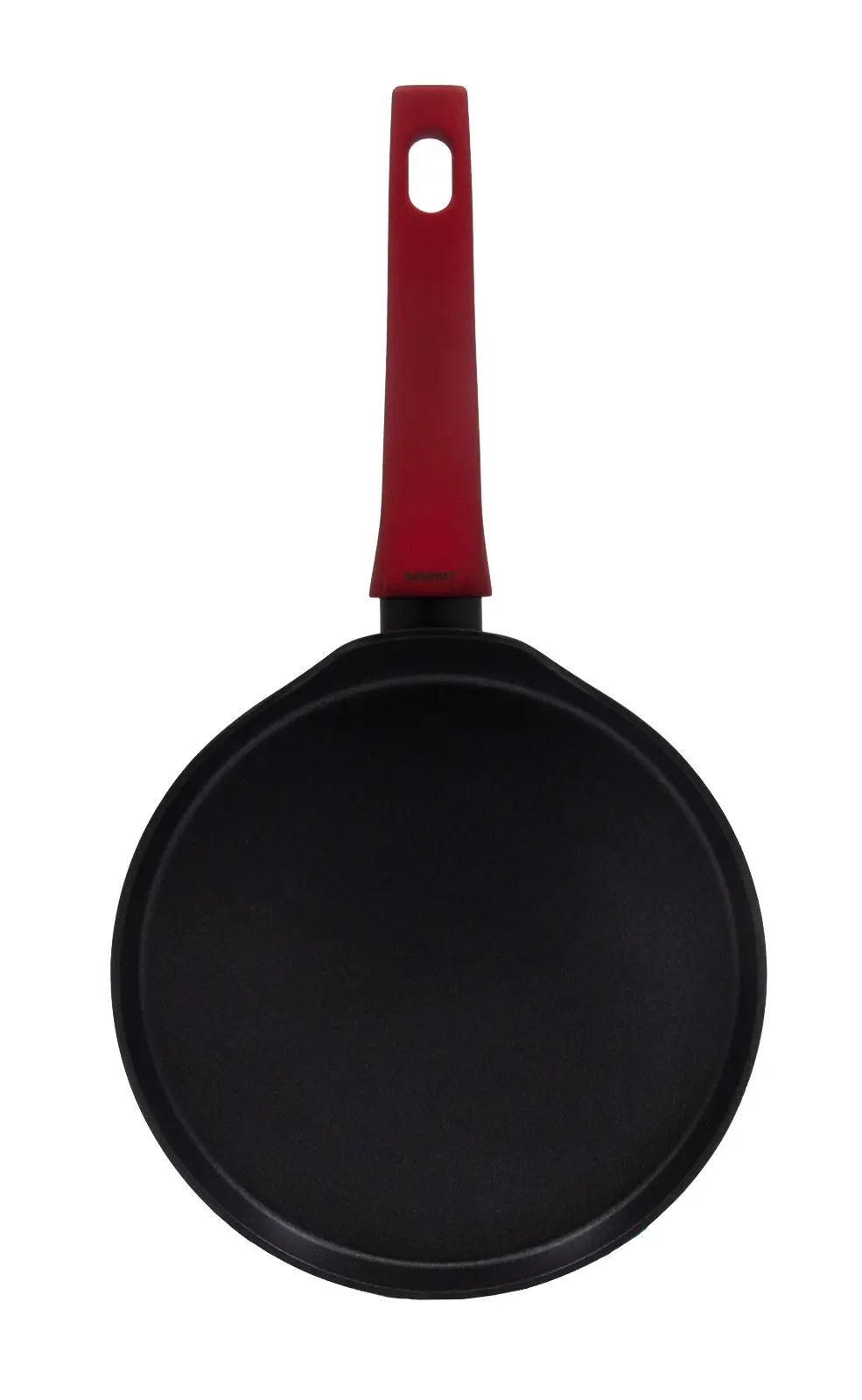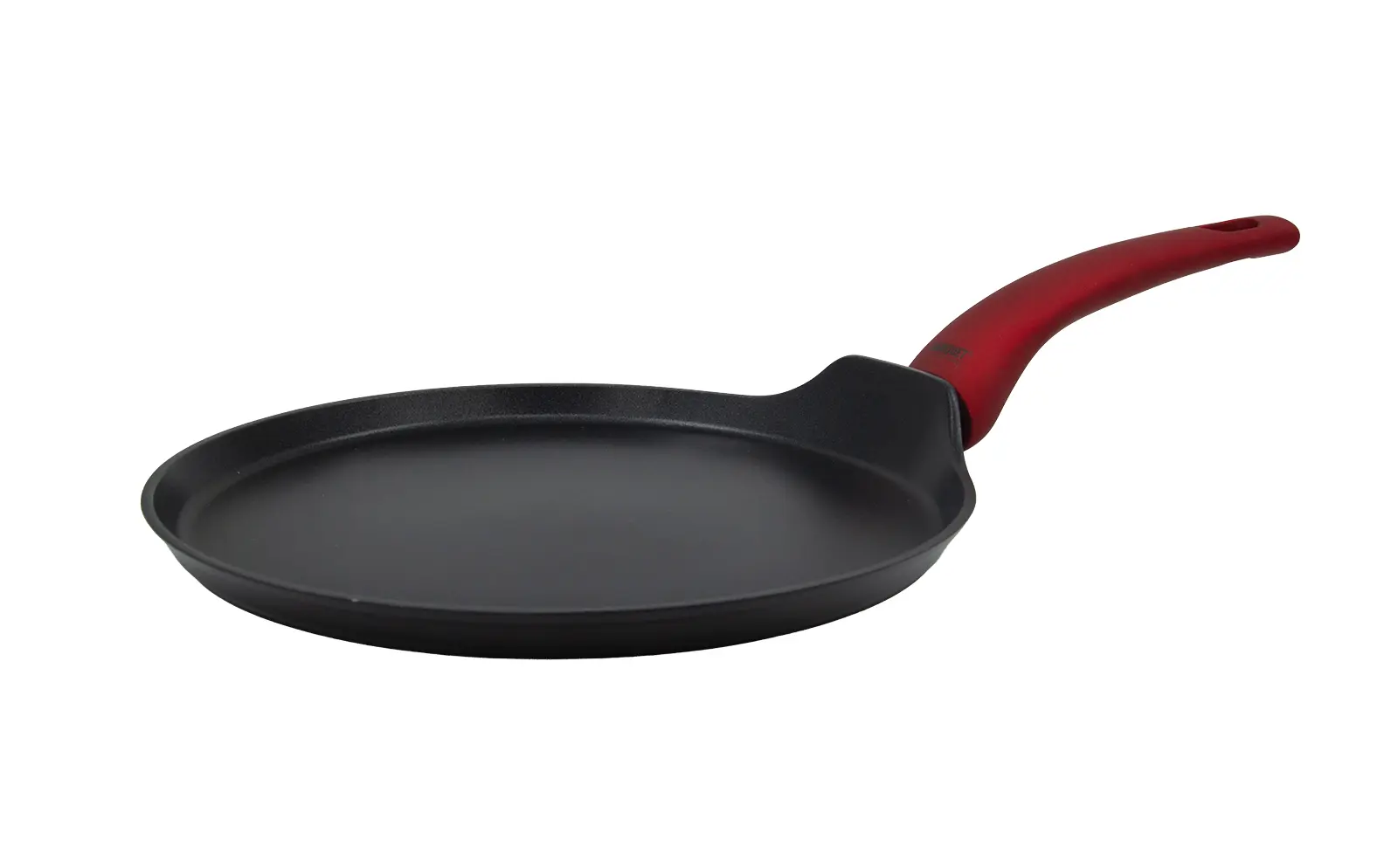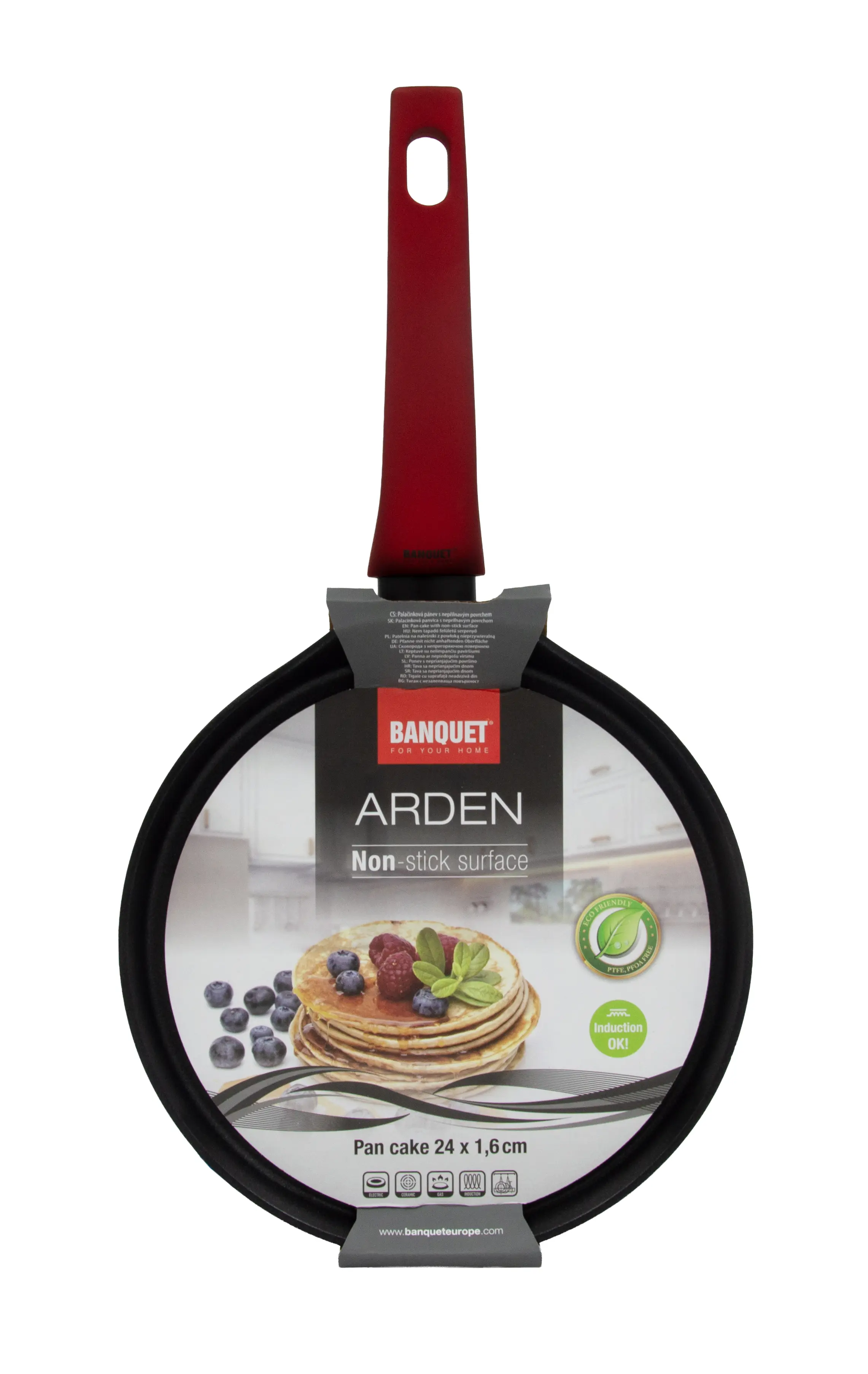 Hliníková liata panvica na palacinky ARDEN 24 x 1,6 cm s nepriľnavým povrchom v čiernej farbe. Hrúbka steny 2,5 mm, soft-touch rukoväť v červenej farbe. Nepriľnavý povrch je veľmi tvrdý a odolný proti poškriabaniu. Vysoká tepelná vodivosť zaisťuje rýchle a ekonomické varenie - dlho drží teplotu. Panvica je odolná proti nárazu a deformácii tvaru. Je vhodná na všetky typy varných dosiek vrátane indukcie.
