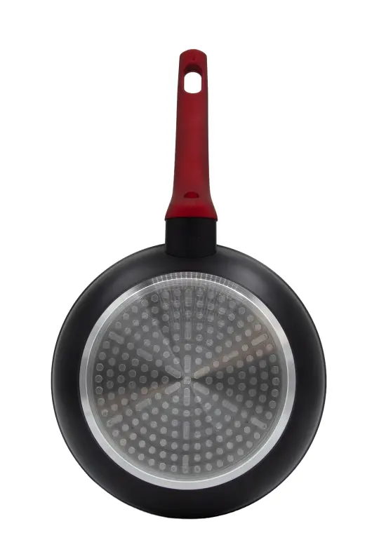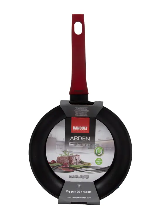 Hliníková liata panvica ARDEN 20 x 4,2 cm s nepriľnavým povrchom v čiernej farbe. Hrúbka steny 2,5 mm, soft-touch rukoväť v červenej farbe. Nepriľnavý povrch je veľmi tvrdý a odolný proti poškriabaniu. Vysoká tepelná vodivosť zaisťuje rýchle a ekonomické varenie - dlho drží teplotu. Panvica je odolná proti nárazu a deformácii tvaru. Je vhodná na všetky typy varných dosiek vrátane indukcie.