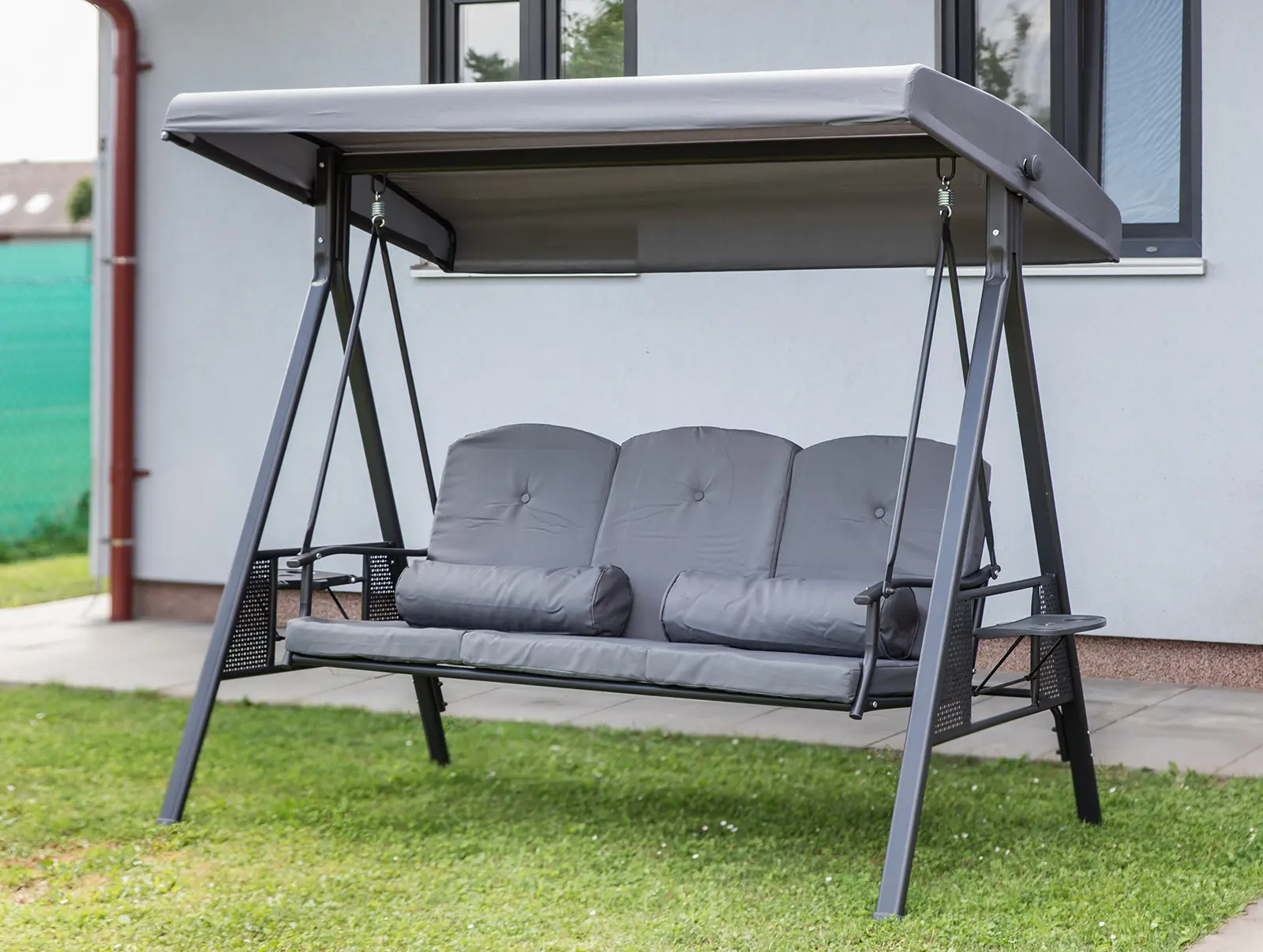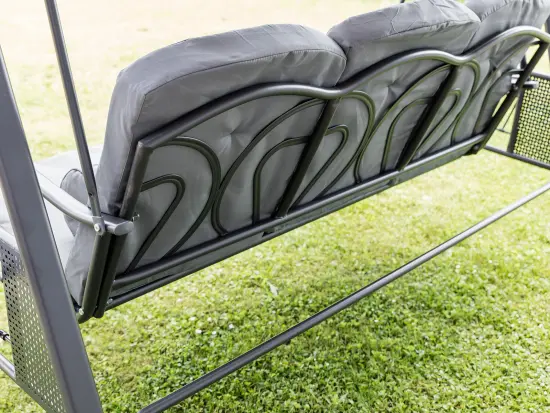 Zahradní houpačka RUJANA má vysoce stabilní masivní kovovou konstrukci, ošetřenou práškovým lakováním a 3 samostatné sedáky z polyesteru o síle cca 8 cm, které zajišťují komfortní posezení. Rozměry houpačky: 200 x 116 x 173 cm, nosnost 300 kg. Dalšími výhodami této houpačky je nastavitelná stříška proti slunci, doplňkový kulatý polštářek pro dokonalý relax a také dva výklopné stolky po stranách houpačky pro odložení oblíbeného občerstvení či knihy.